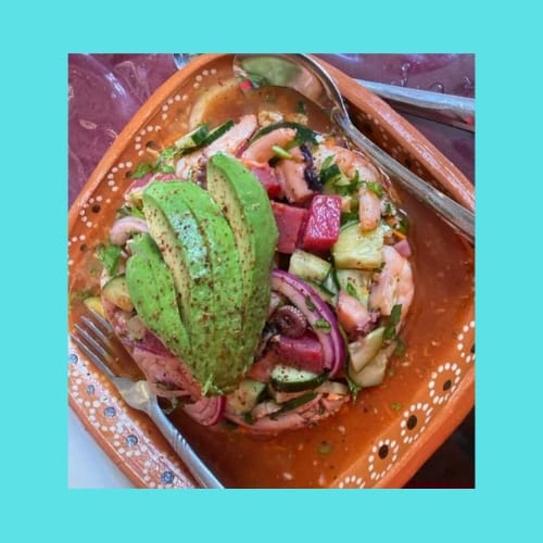 camaron, pulpo y callo con salsa de la casa montado sobre una cama de ceviche.