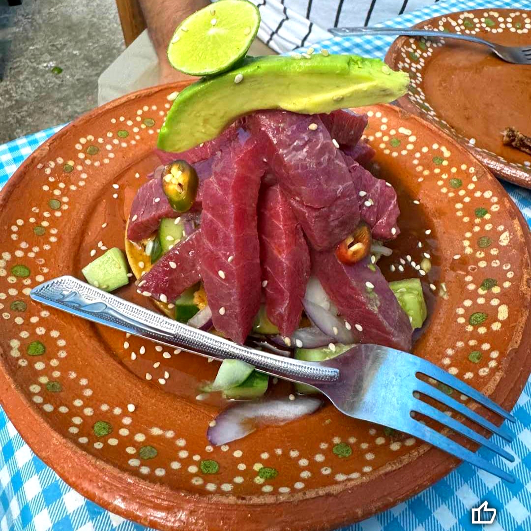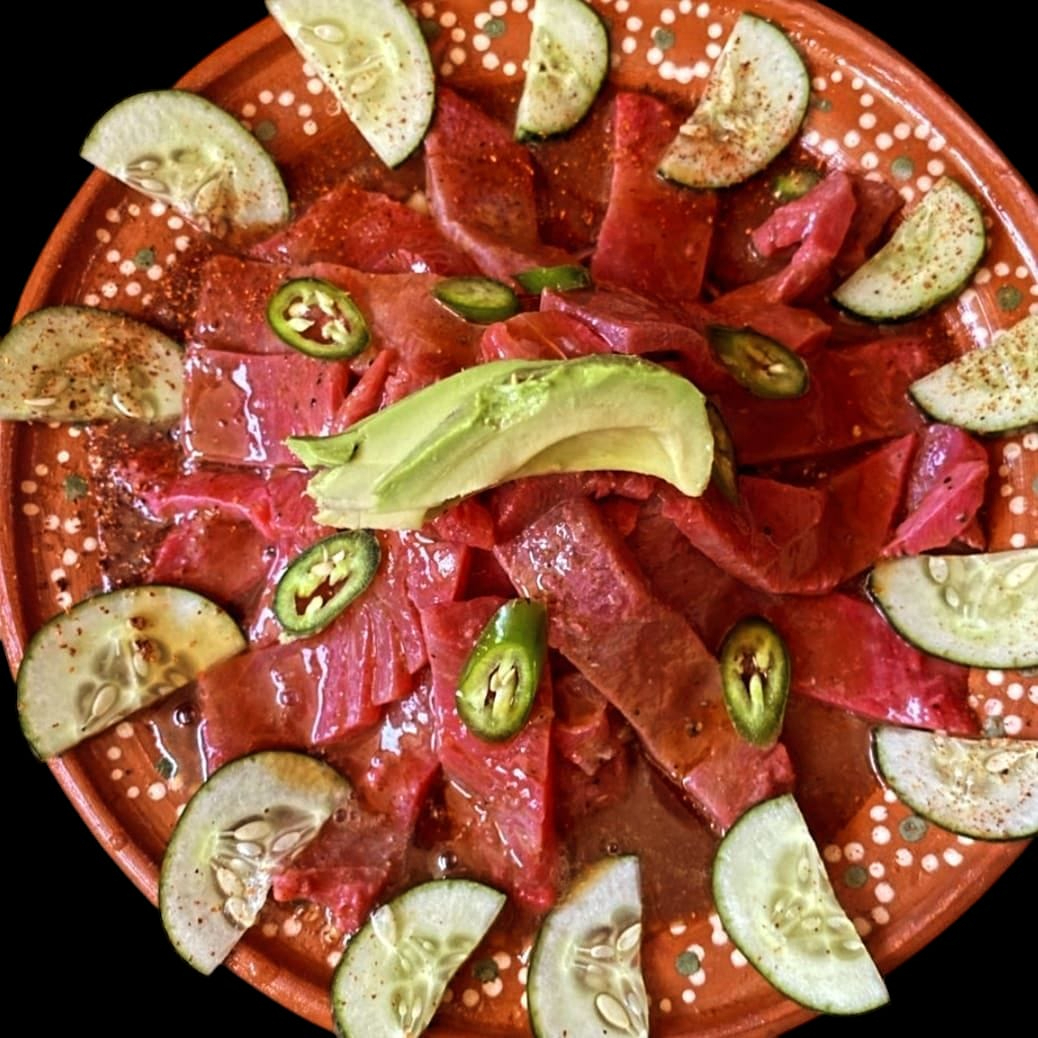 Atùn en tiras curtido en limon marinado con salsa dse la casa montado en cama de pepino, cebolla chile serrano y aguacate.