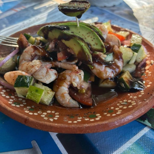 camaron en cubos cocido en limon, salsa mexicana banado en salsa de la casa.