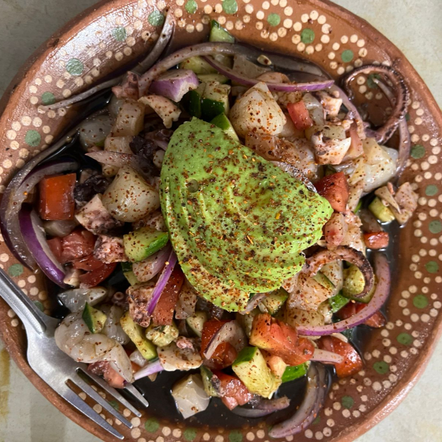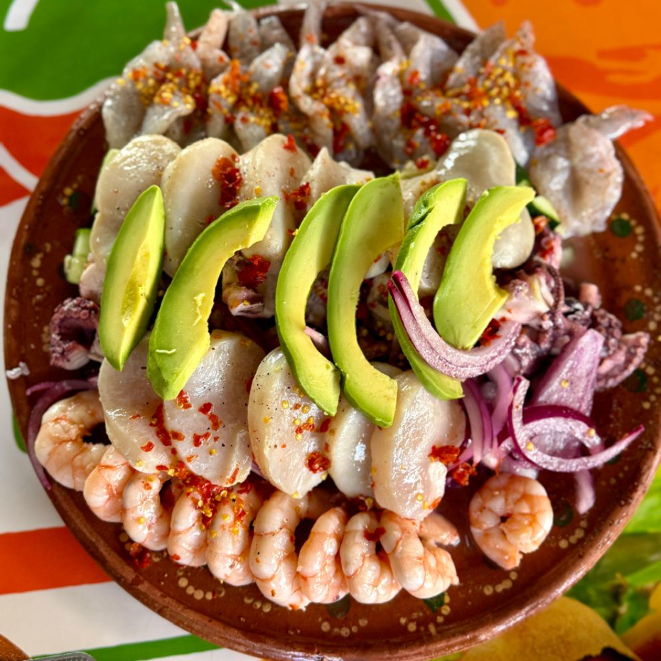 Camaron, pulpo, tiras de cebolla salseado con chiltepin y coronado con callo de hacha.