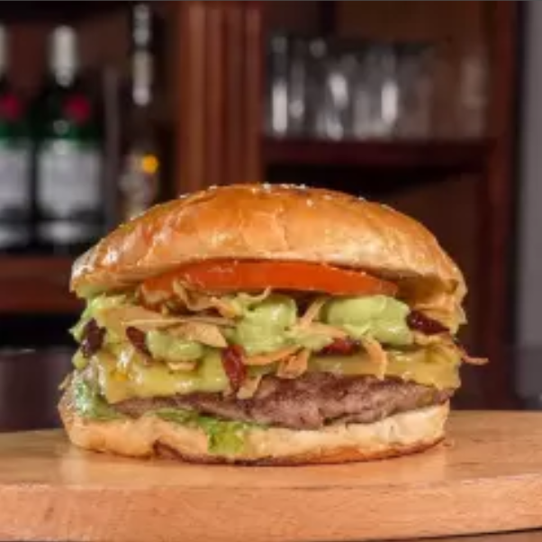 Hamburguesa con carne de res 210 gr, guacamole, totopos, mezcla de chile chiltepin y cebolla caramelizada, queso y papas a la francesa 100 gr.
