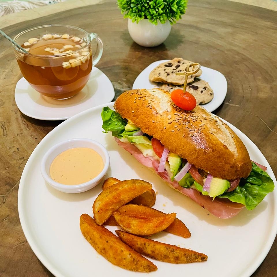 Jamón de pavo, queso mozarella gratinado, lechuga, aguacate, jitomate, cebolla y aderezo de tu elección.