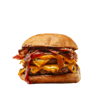 Dos jugosas carnes de res a la parrilla, apiladas con queso cheddar derretido, crujiente tocino ahumado, cebollas caramelizadas coronado con salsa especial. Servida en un pan brioche tostado que apenas contiene tanta grandeza. ¡Un desafío gigante para los verdaderos amantes de las hamburguesas