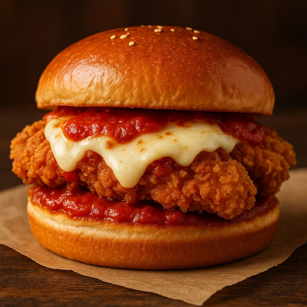 La combinación perfecta: pollo crispy, queso cremoso y salsa de pizza en una hamburguesa que no podrás soltar.