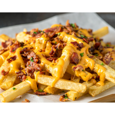 Crujientes Papas cubiertas con queso cheddar derretido y trozos de tocino irresistibles y llenas de sabor