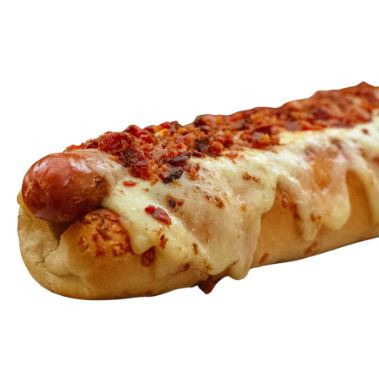 Jugosa salchicha, bañada en una mezcla de quesos fundidos y coronada con crujiente tocino, pura Indulgencia