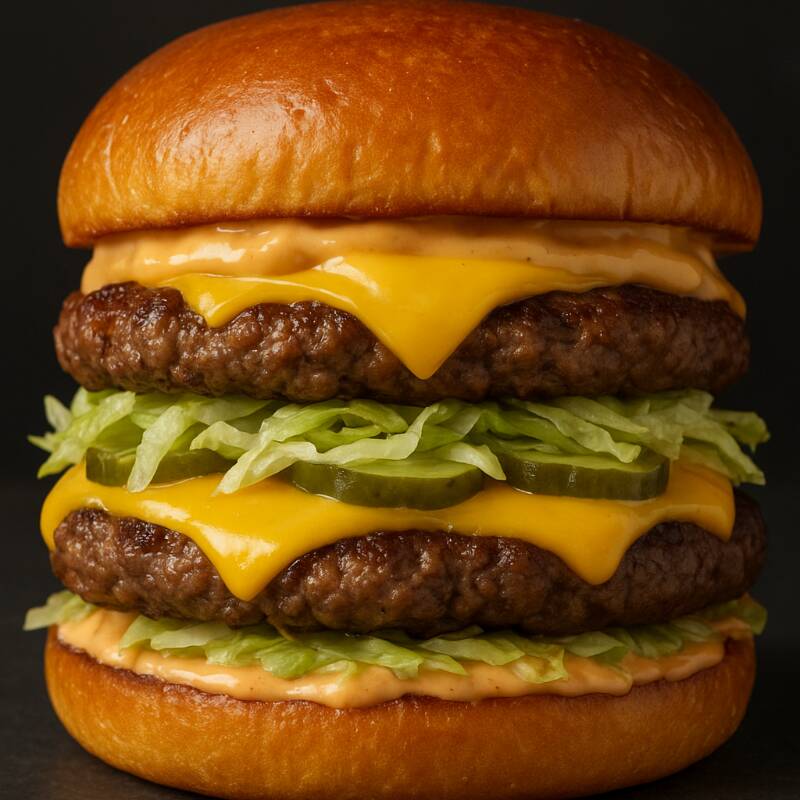Dos jugosas carnes de res con crujiente tocino y doble queso cheddar derretido en cada bocado