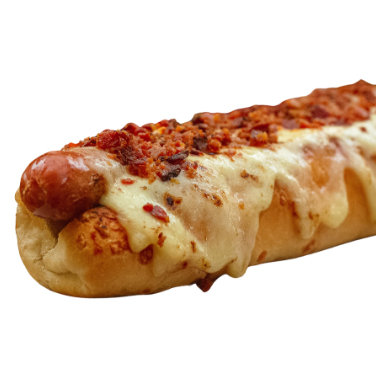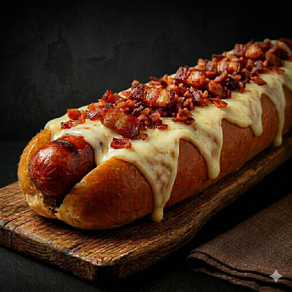 Jugosa salchicha bañada en una mezcla de quesos fundidos y coronada con crujiente tocino. Pura indulgencia