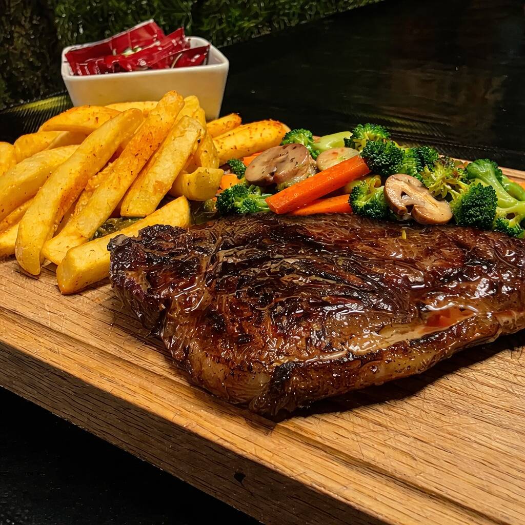 ENGLISH: Premium steak cuts grilled to perfection, served with crispy fries and sautéed vegetables for a complete and satisfying meal. ESPAÑOL: Cortes premium a la parrilla en su punto, acompañados de papas crujientes y verduras salteadas para una comida completa y deliciosa.