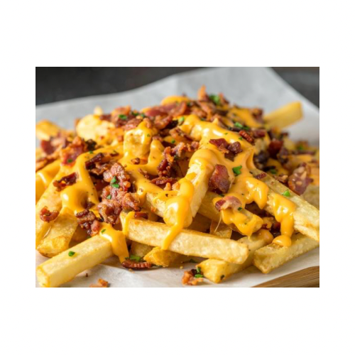 Crujientes Papas Cubiertas con Queso Cheddar derretido y trozos de tocino irresistible y llenas de sabor.