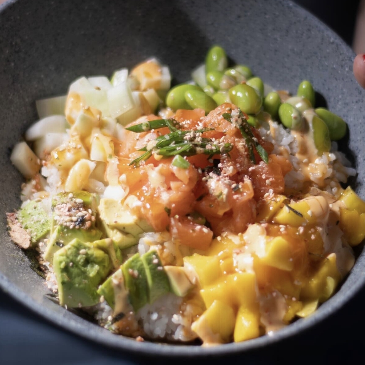 ARROZ, SALMÓN, PEPINO, EDAMAMES, MANGO, AGUACATE, SALSA DULCE Y MAYONESA SPICY.