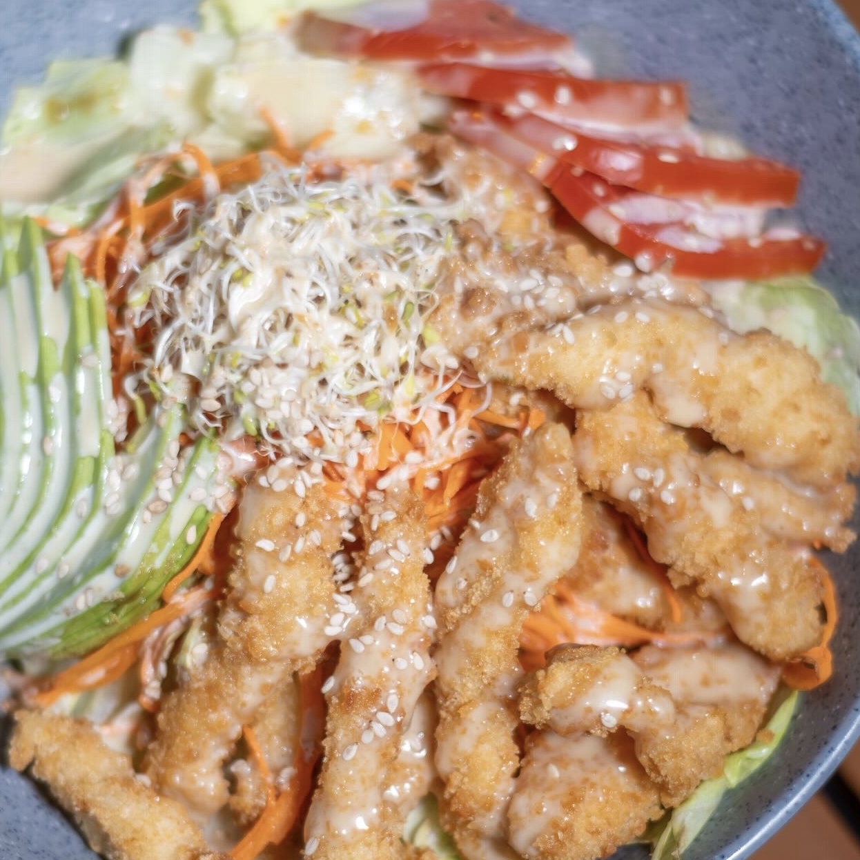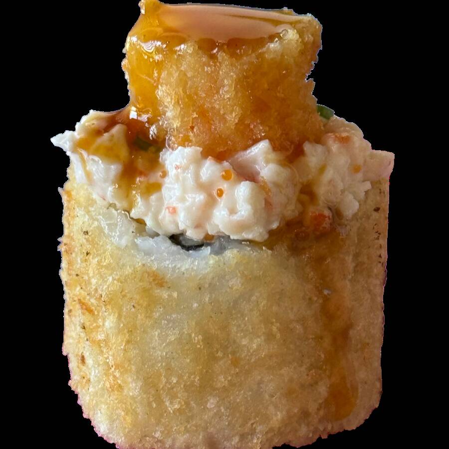 Por dentro: salmón, arroz, espárrago, queso crema, pepino y aguacate. Por fuera: empanizado, alga, ensalada kani, salsa dulce y camarón empanizado.