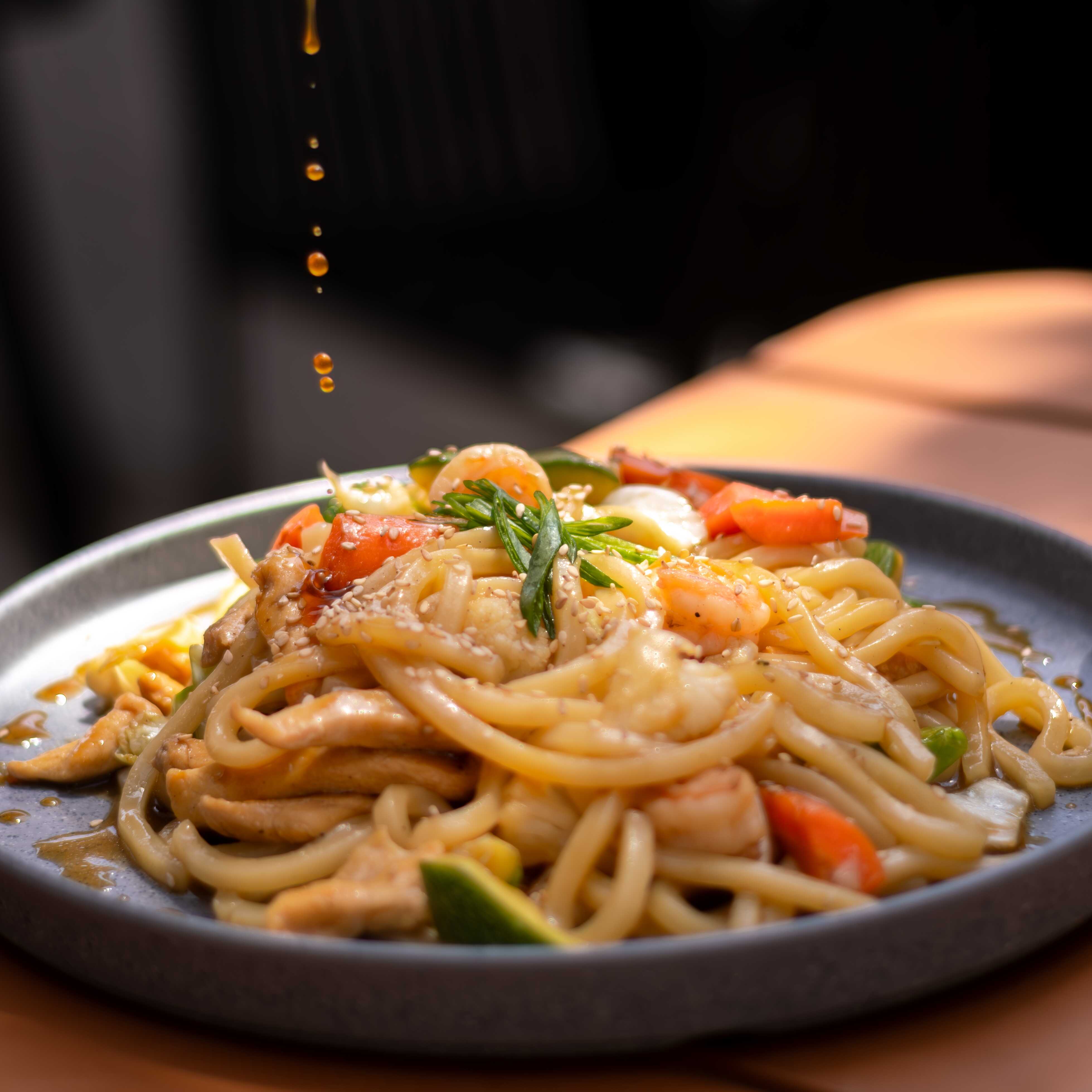 Camarón, fideos de udon salteados con brócoli, zanahoria, col, cebollín, coliflor y salsa hoisin.