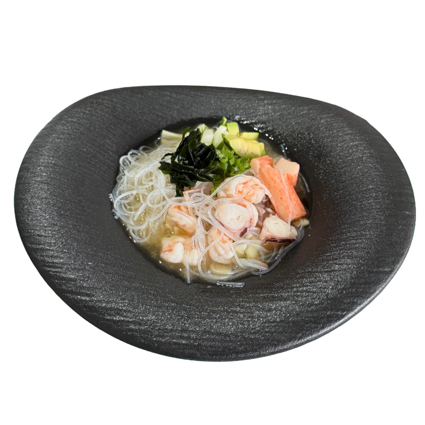 CALDO MISO, FIDEO DE ARROZ, CAMARÓN, PULPO, KANIKAMA, SURIMI, CEBOLLÍN, AGUACATE, ARROZ, WAKAME, LIMÓN Y UN TOQUE DE SERRANO.