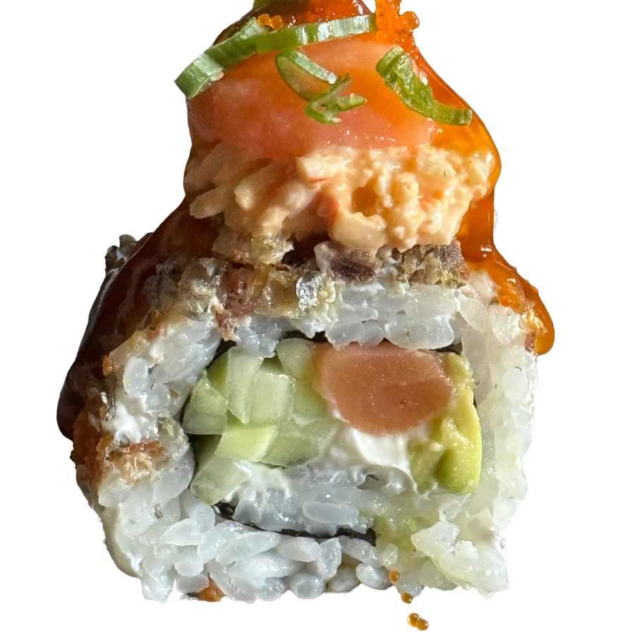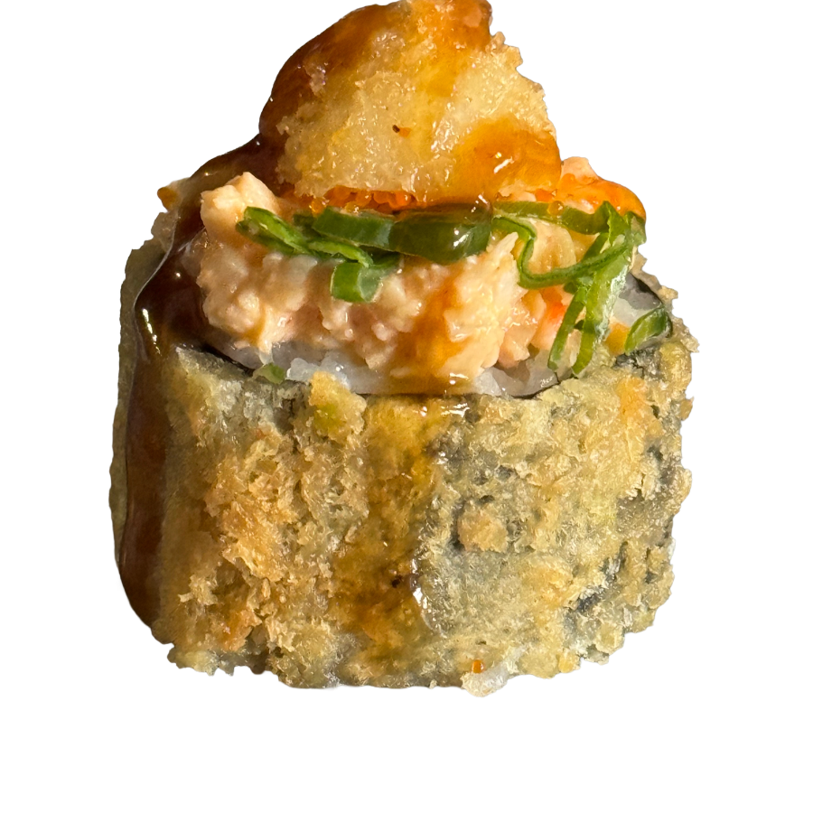 ARROZ, MASAGO, TAMPICO, AGUACATE, CAMARÓN EMPANIZADO, QUESO CREMA, CEBOLLÍN Y SALSA DULCE.