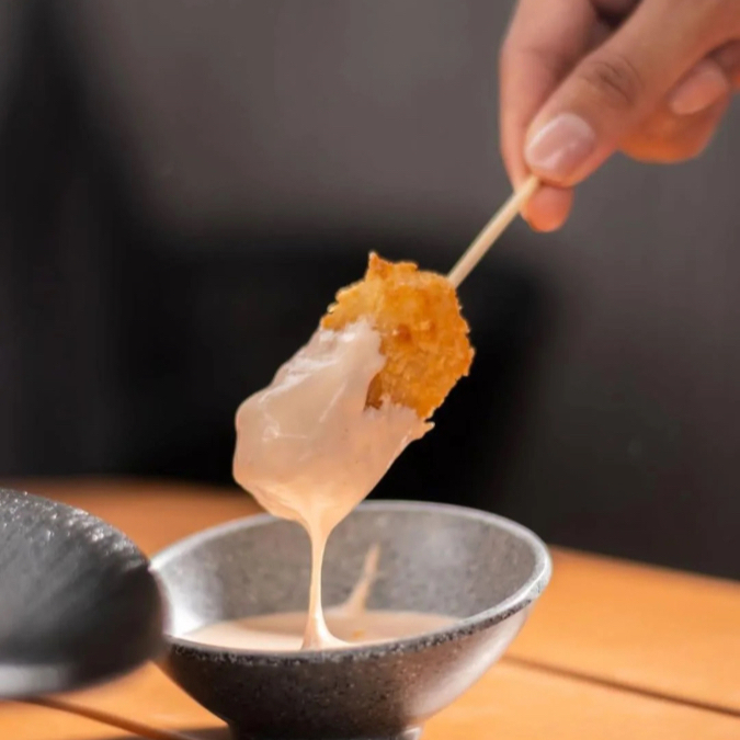 Brochetas de queso y camarón empanizadas (3 pzas queso y 3 pzas camarón).