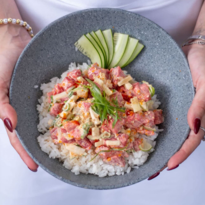 ARROZ, ATÚN, PEPINO, CEBOLLÍN, MASAGO, MAYONESA, SRIRACHA, CILANTRO Y LÁMINAS DE LIMÓN.