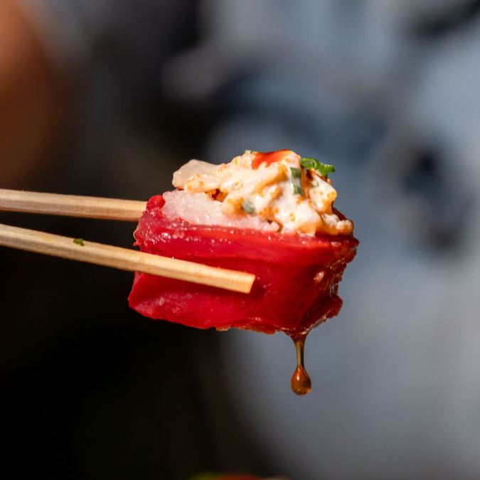 Por dentro: arroz, ensalada de callo y aguacate. Por fuera: atún, ensalada de callo, sriracha y salsa especial.