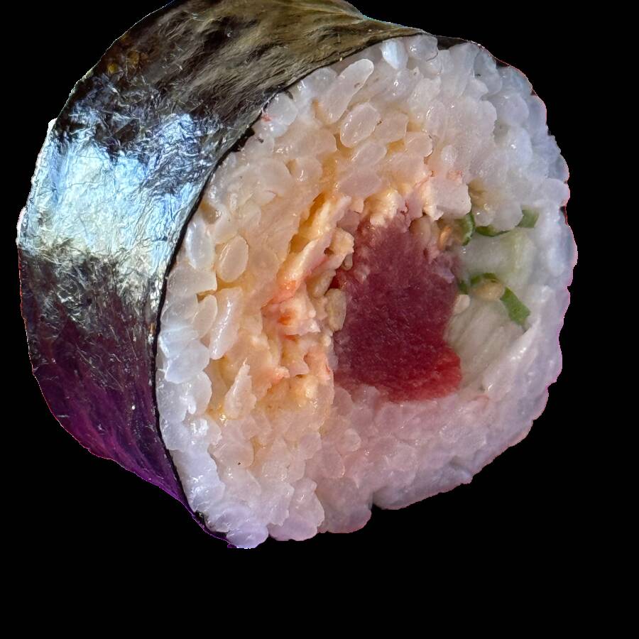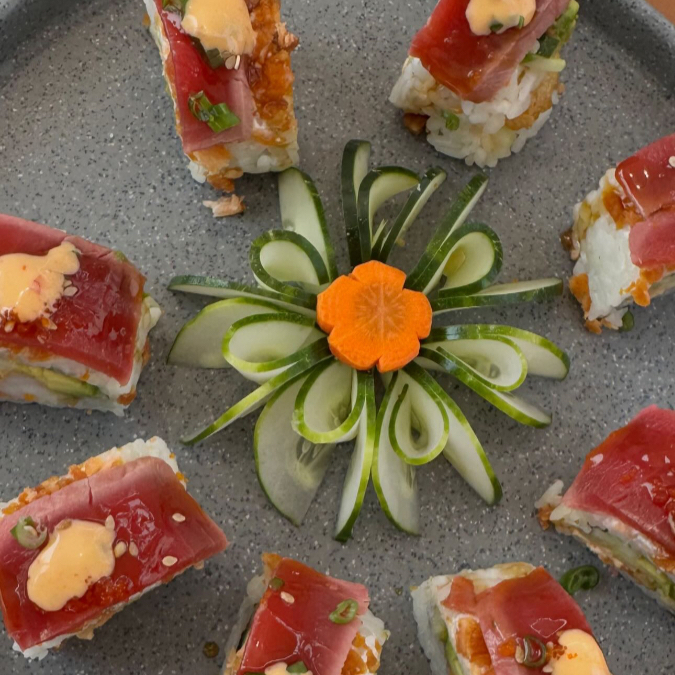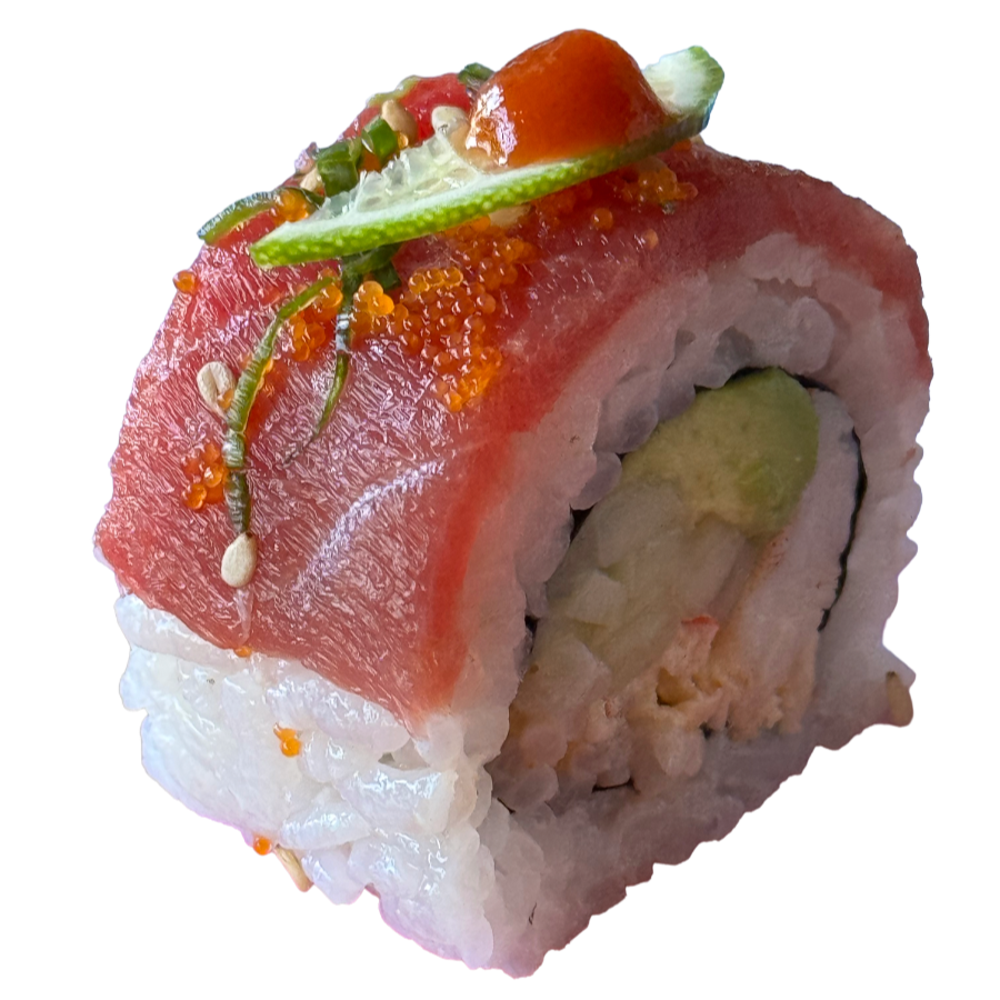 Por dentro: alga, pepino, aguacate, tampico y camarón. Por fuera: arroz, atún, cebolla, masago, láminas de limón, sriracha y salsa especial ponzu.