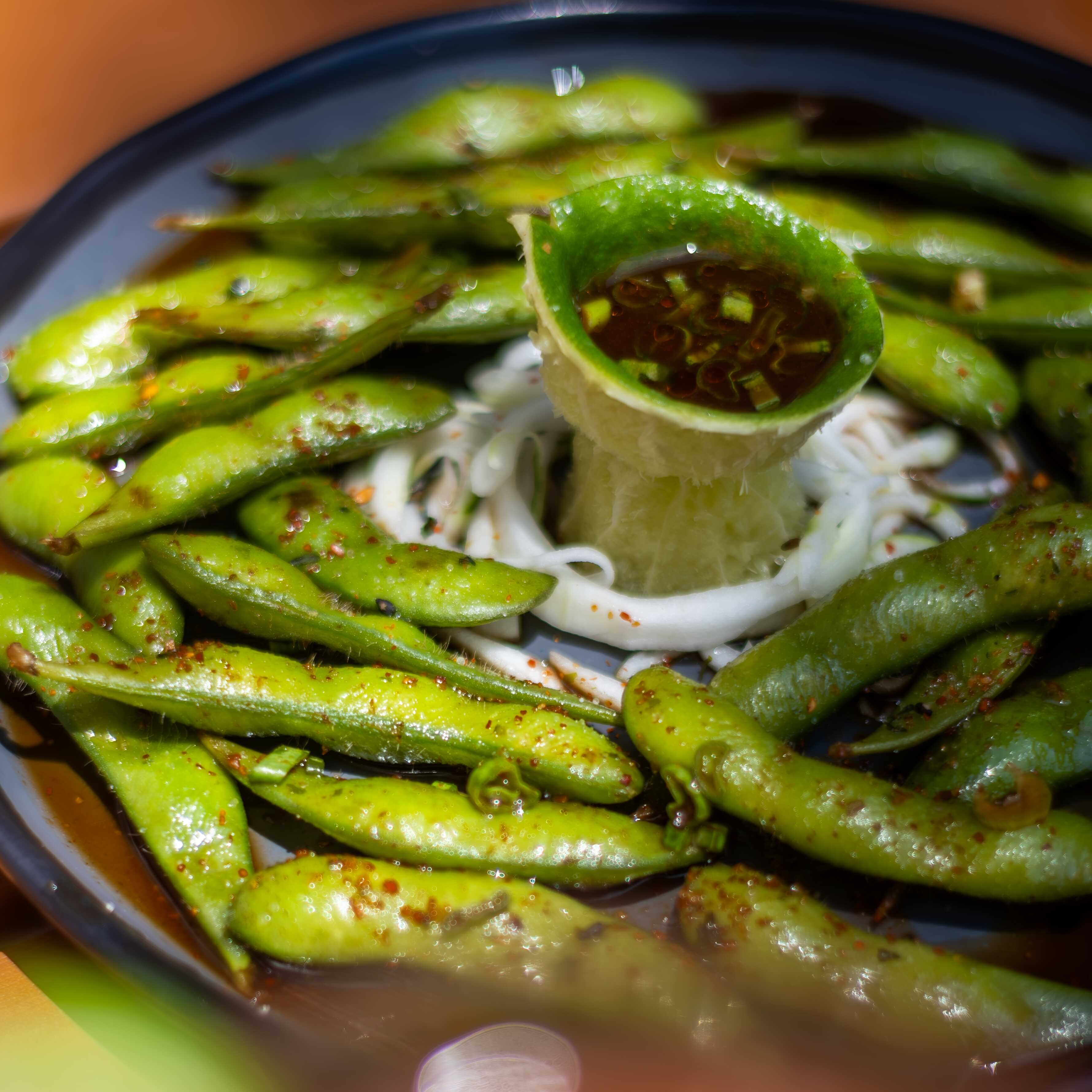 FRIJOL DE SOYA AL VAPOR SALTEADOS CON MANTEQUILLA DE AJO, SOYA PONZU Y CHILE EN POLVO.
