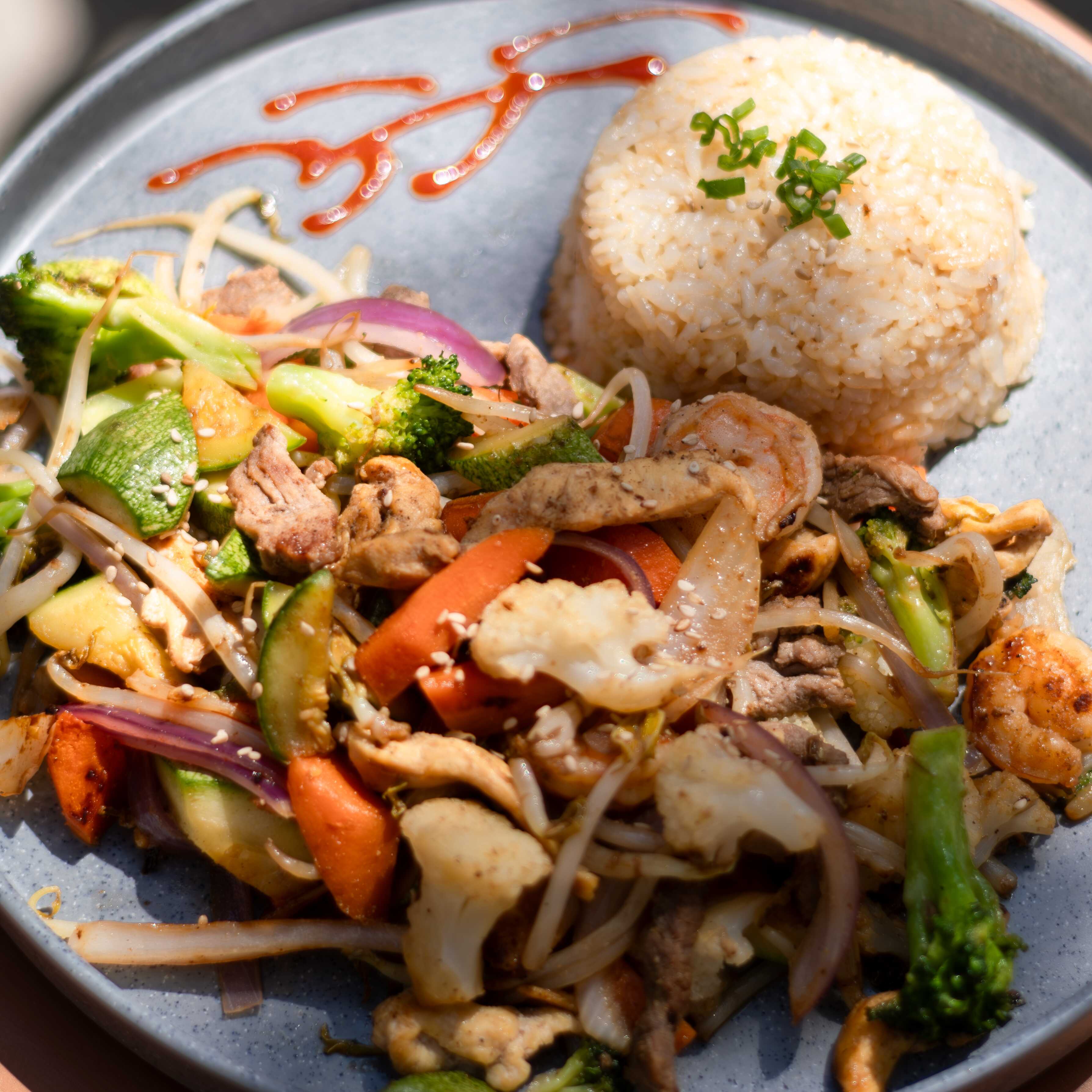 Pollo, res, camarón, arroz al vapor, zanahoria, brócoli, calabaza, champiñones y salsa teriyaki.