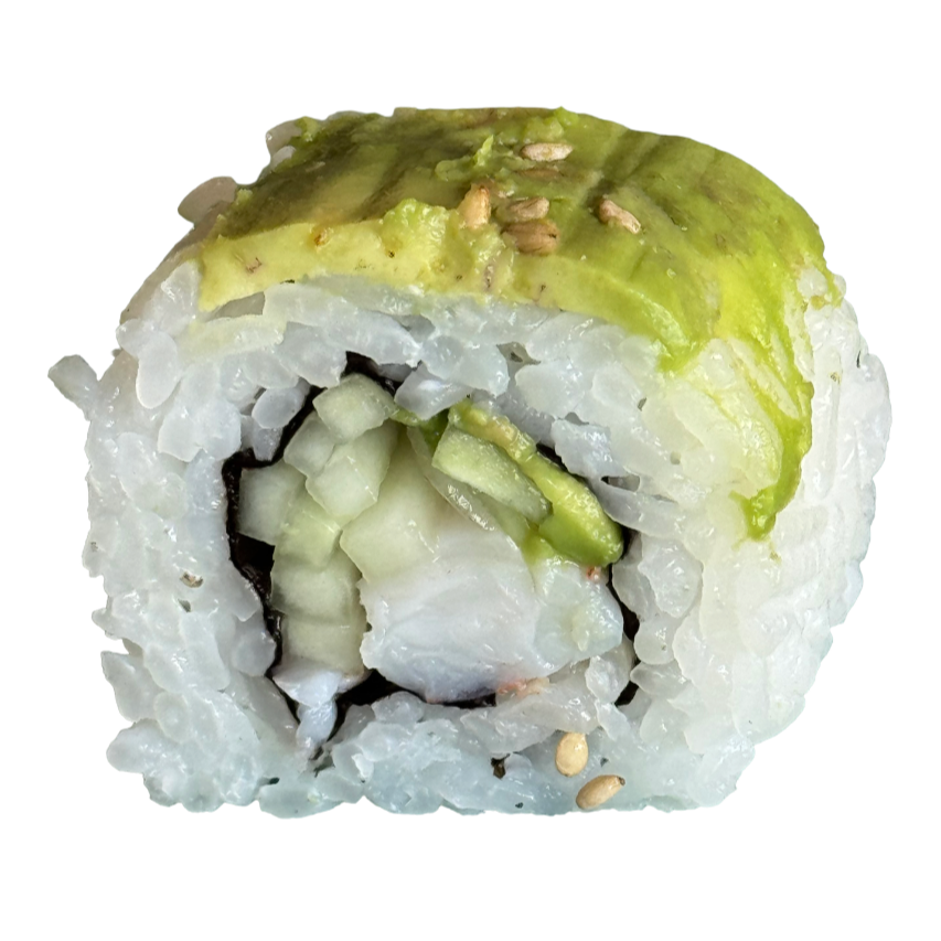Por dentro: alga, pepino, camarón y aguacate. Por fuera: arroz, aguacate y ajonjolí.