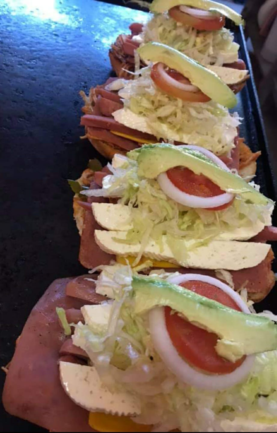 Torta, jamón, queso amarillo, lechuga, jitomate, cebolla, chile jalapeño y aguacate