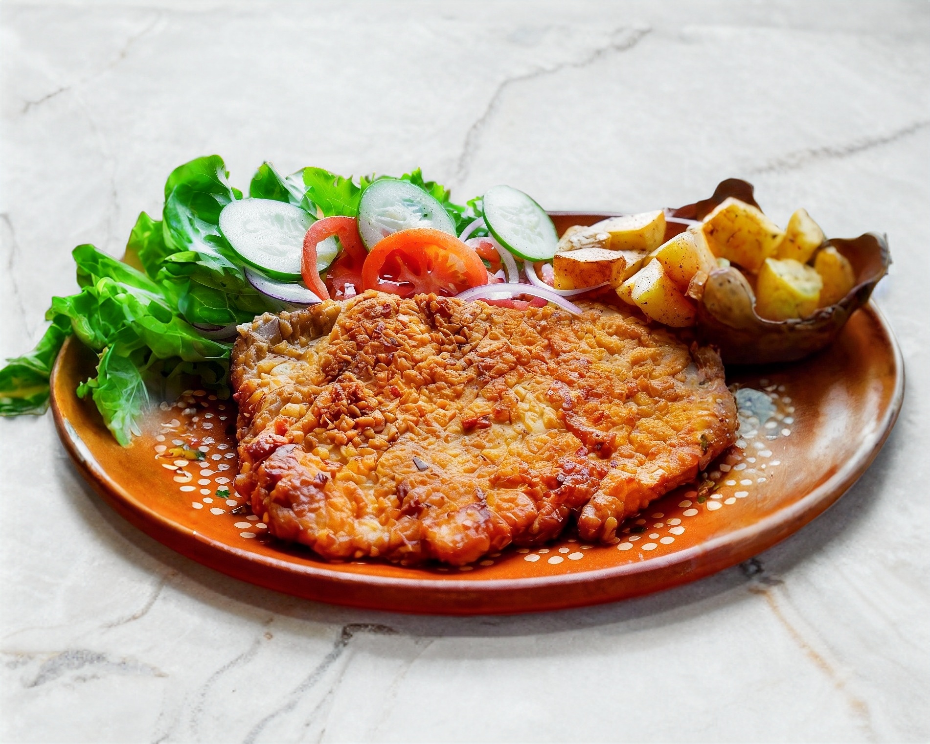 Milanesa de pollo, arroz, frijoles, ensalada.