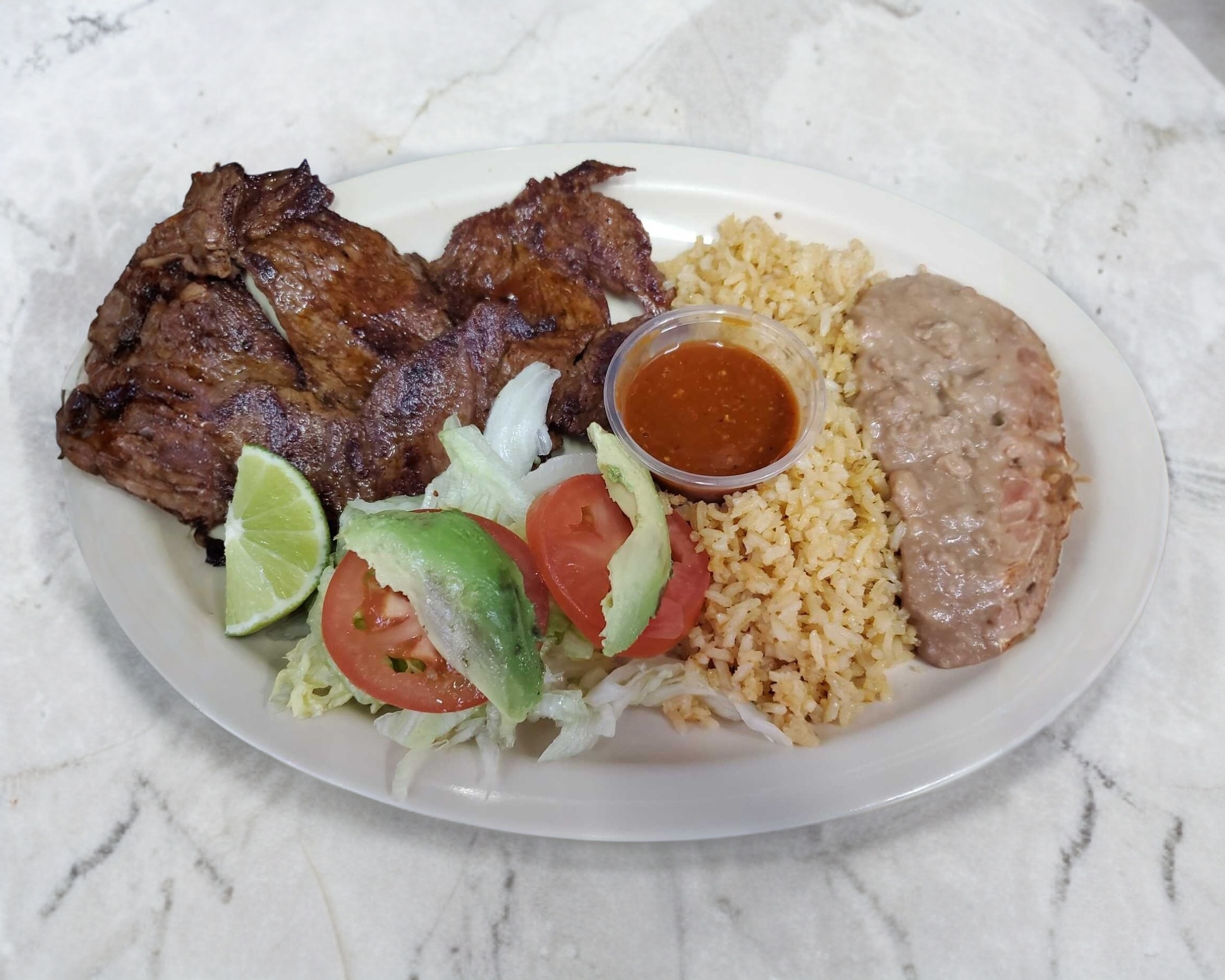 Carne asada, arroz, frijoles, salsa mexicana.