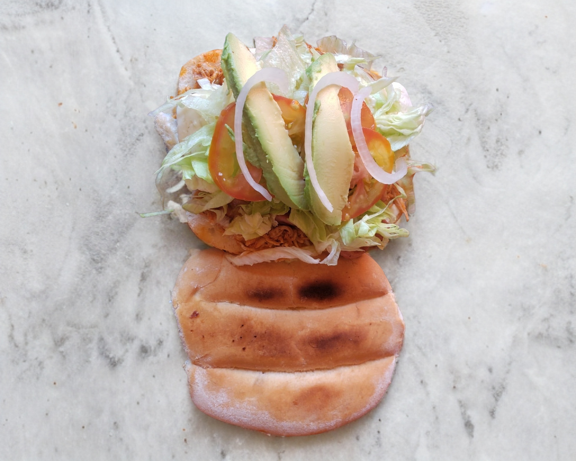 Torta, milanesa de pollo, lechuga, jitomate, cebolla, chile jalapeño, aguacate.