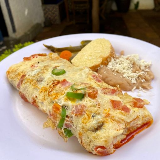 Omelette (tocino, jamón, salchicha, espinaca, champiñón, chorizo) frijoles y ensalada. Elegir un ingrediente