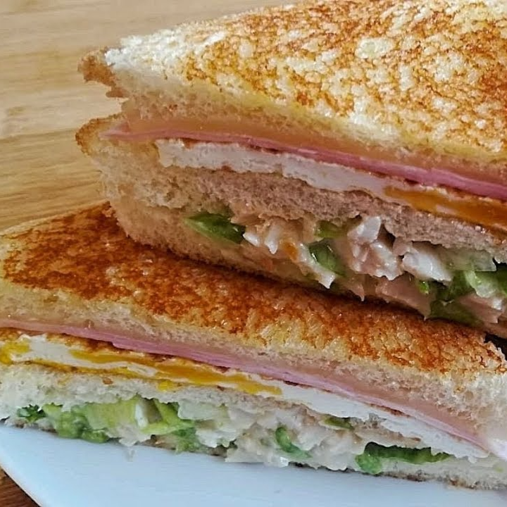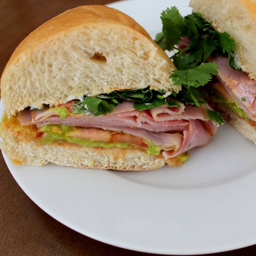 Pan integral, jamón, mantequilla, mayonesa, queso amarillo, lechuga, jitomate, cebolla, chile jalapeño y aguacate