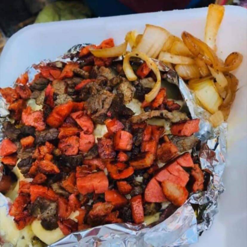 Papa, queso gratinado, carne a elegir (asada, adobada o chorizo). Elegir un ingrediente