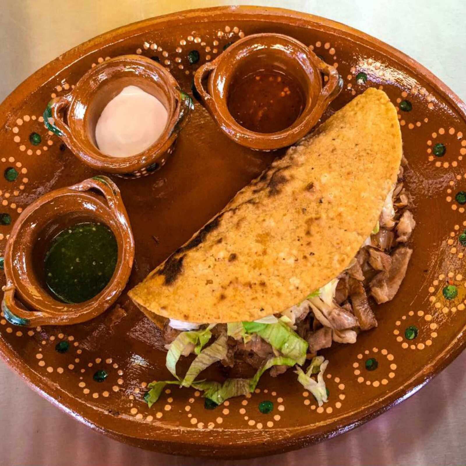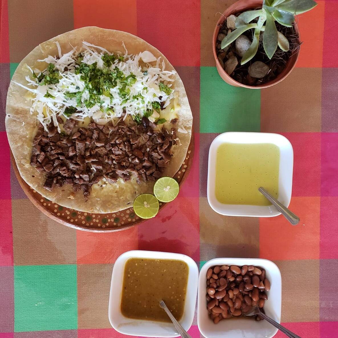 Quesadilla (tortilla torteada de Maiz), carne asada, col, cebolla, cilantro.