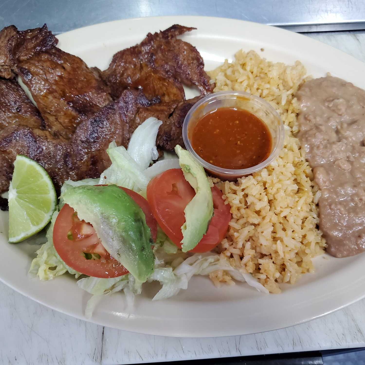 con (asada, adobada, chorizo) frijoles y ensalada.