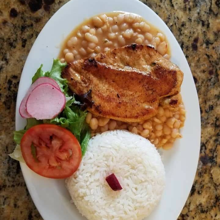 Pechuga de pollo a la plancha, arroz, frijoles, ensalada.