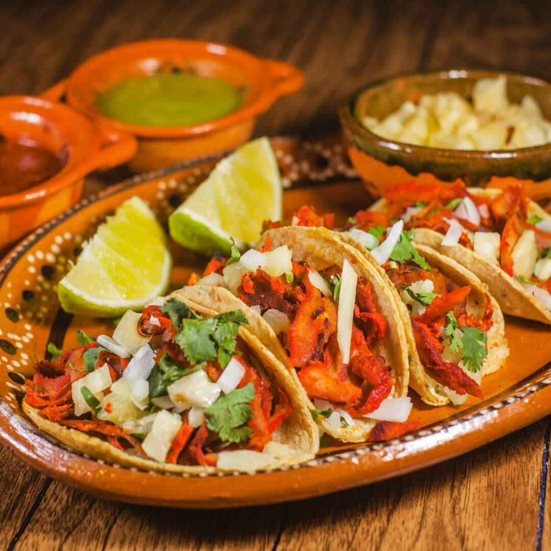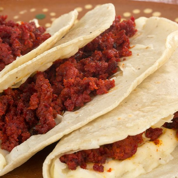 tortilla de maiz torteada, queso cheddar, chorizo corona, repollo, cebolla y cilantro