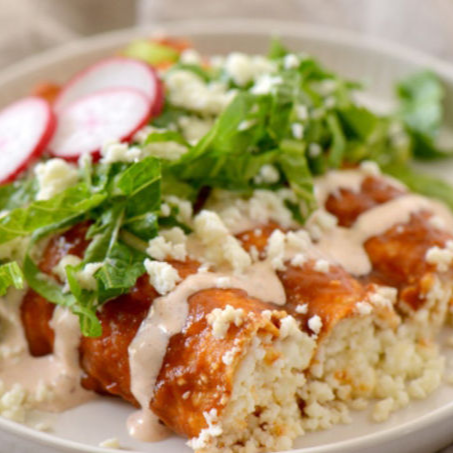 Enchiladas estilo Mexicano, a elegir (Pollo, Pierna o Picadillo) lechuga, queso, crema y cebolla desflemada. (5pzas)