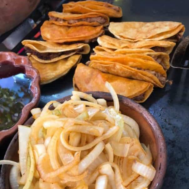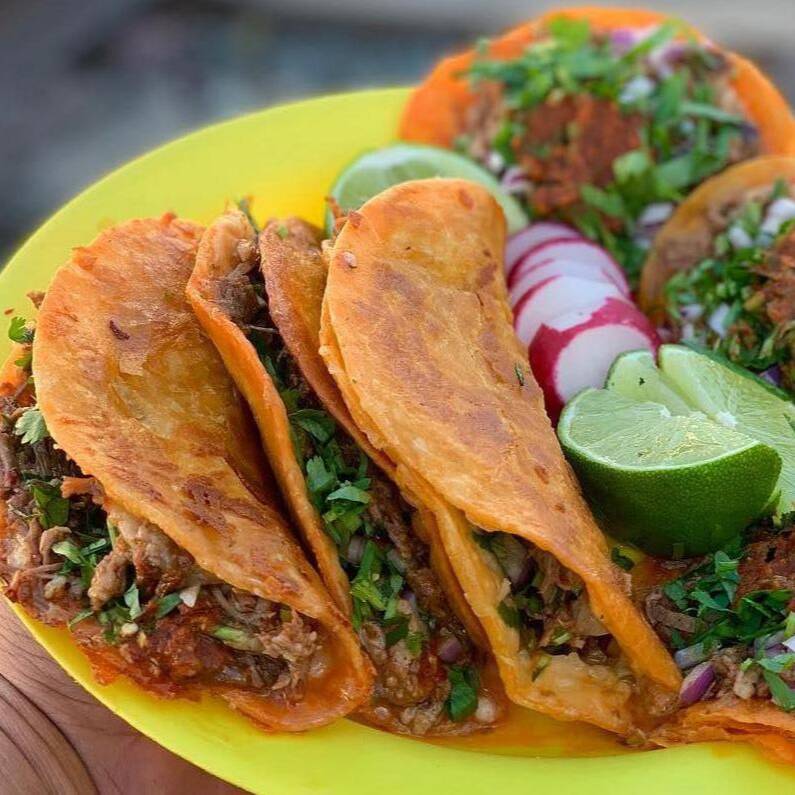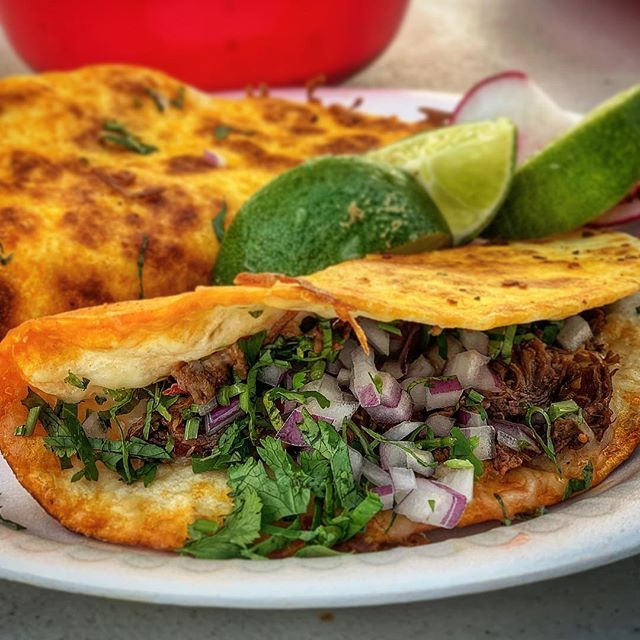 Quesadilla de tortilla de maiz torteada, birria de res, col, cebolla, cilantro, cebolla dorada, salsas y consome.