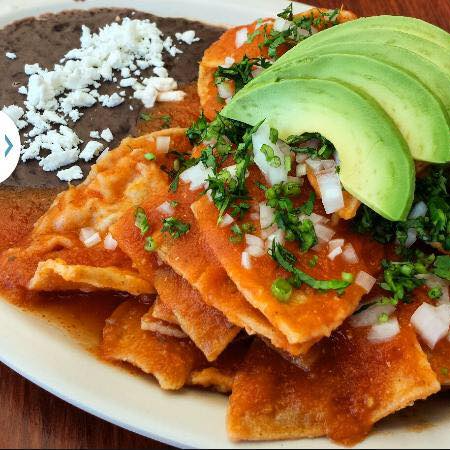 Chilaquiles con res o pollo, frijoles y ensalada.