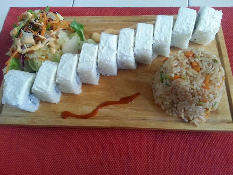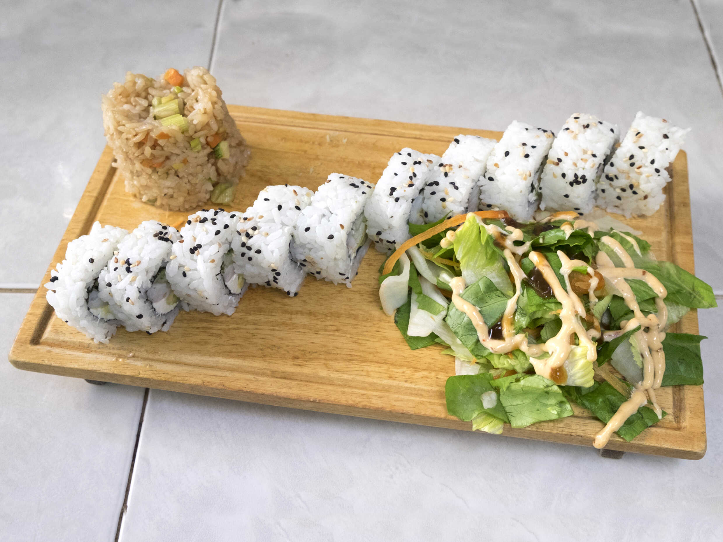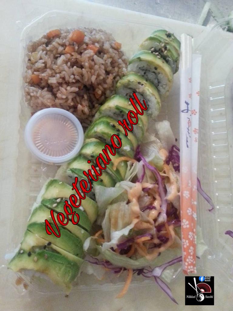 Pepino, aguacate, queso Philadelphia, zanahoria por fuera, ajonjolí mixto y salsa de anguila, Todos nuestros rollos llevan arroz frito y ensalada.