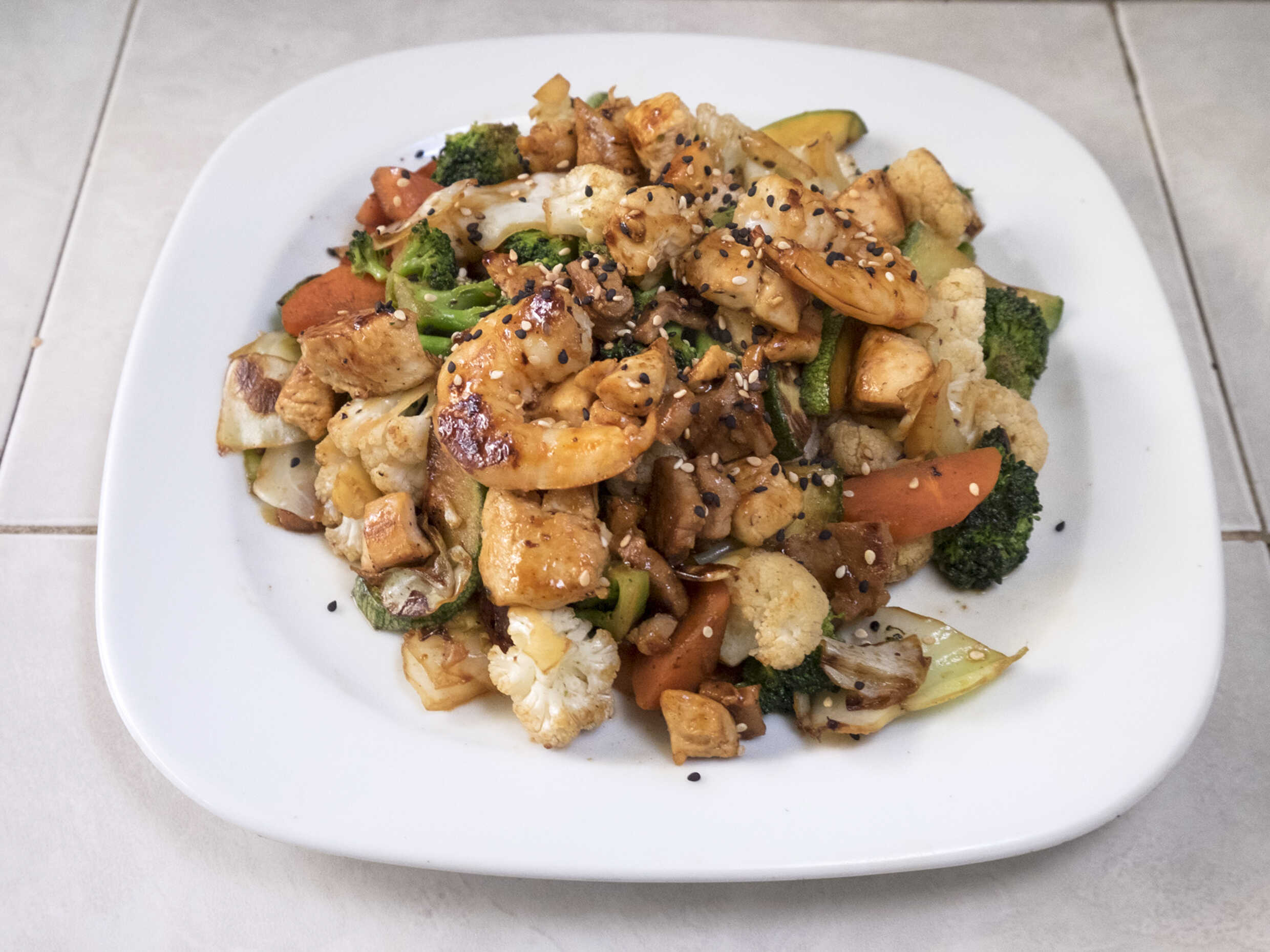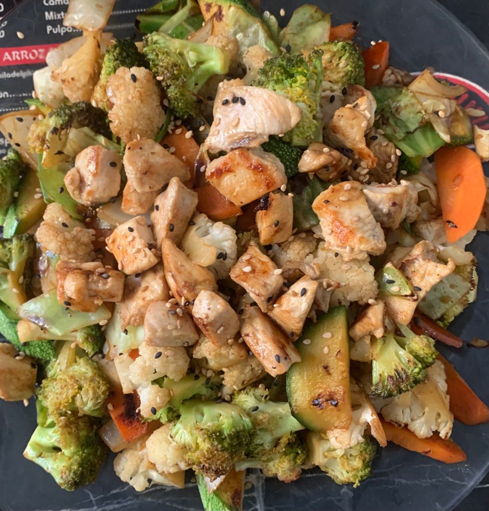 Verduras asadas a la plancha,arroz al vapor y pollo marinado a la plancha