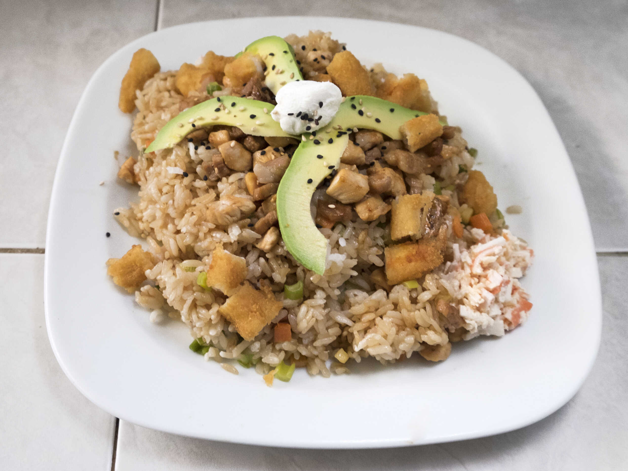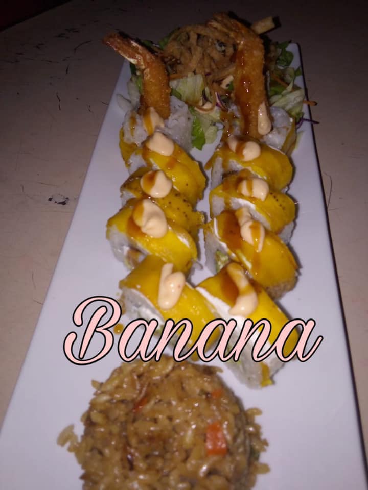 Camarón frito, aguacate, queso Philadelphia, aderezo especial, salsa de anguila cubierto con plátano macho frito, Todos nuestros rollos llevan ensalada y arroz frito.