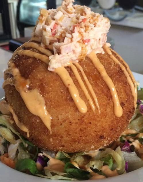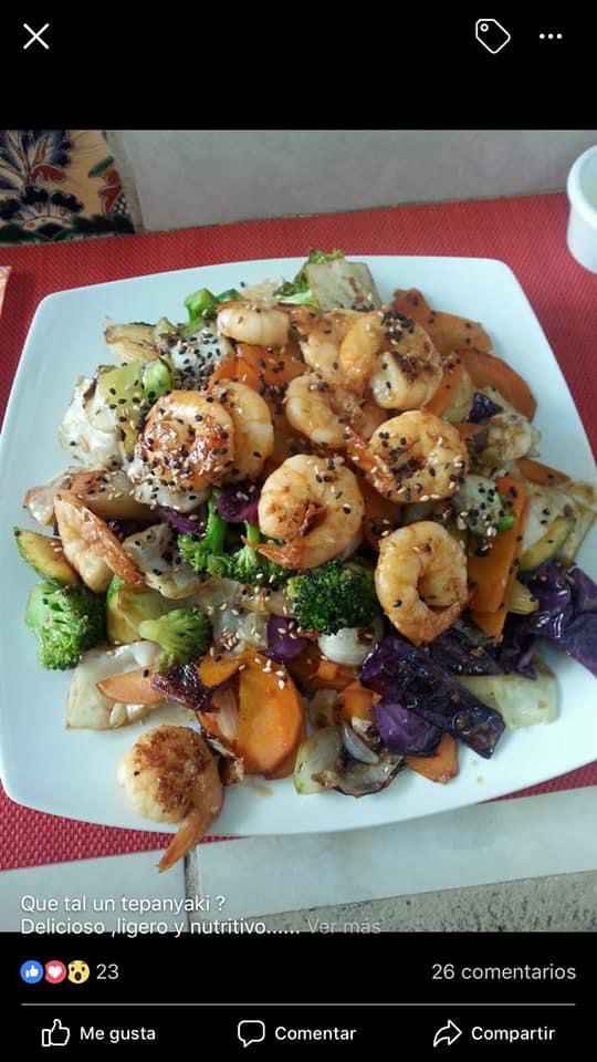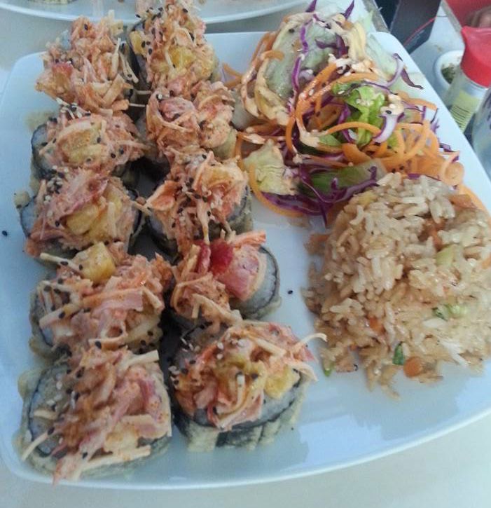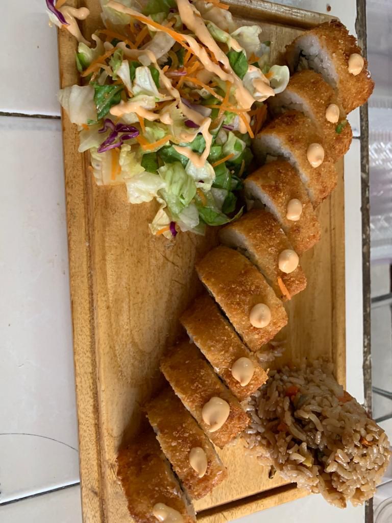 Sushi frito. Camarón, aguacate,pepino, Philadelphia, coco rayado, aderezo especial, salsa de anguila. Todos nuestros rollos llevan ensalada y arroz frito.