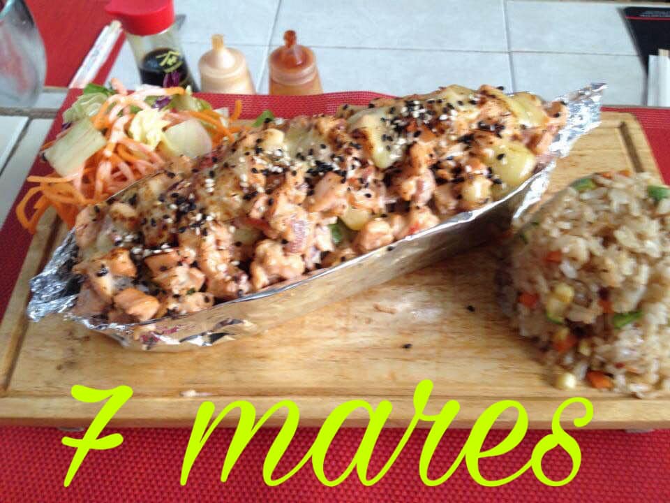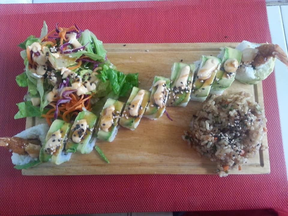 Kanikama, camarón, marlin, aguacate, mango, queso Philadelphia y salsa anguila. Todos nuestros rollos llevan ensalada y arroz frito.