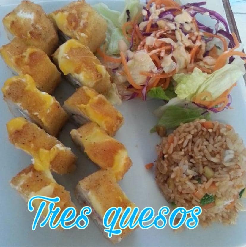 Rollo frito, camarón, queso Philadelphia, aguacate por fuera, queso gouda y amarillo. Todos nuestros rollos llevan ensalada y arroz frito.