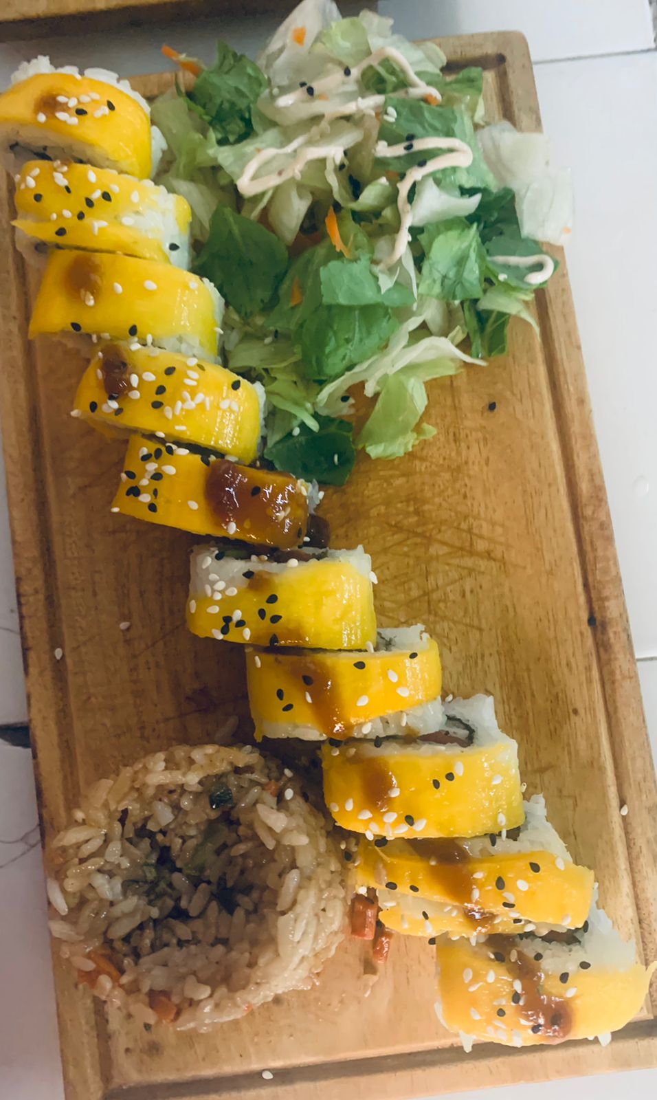 Atún, surimi,aguacate, pepino, cubierta de mango, salsa dulce, ajonjolí mixto. Todos nuestros rollos llevan arroz frito y ensalada.