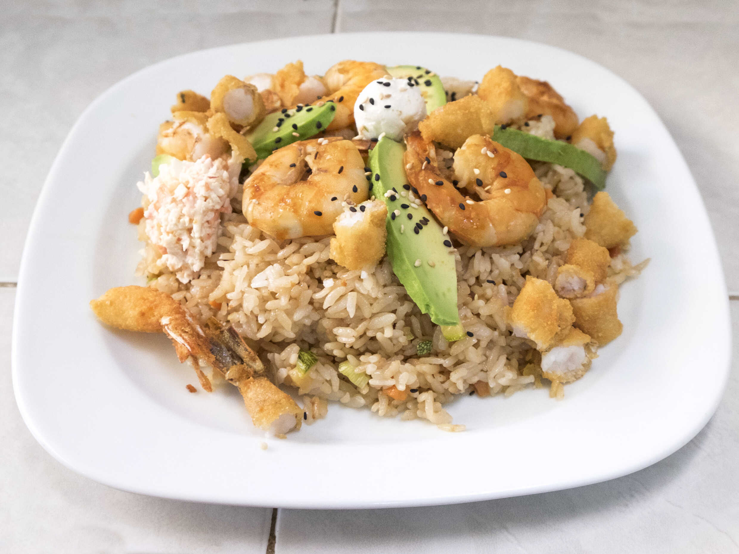 Camarón frito,queso Philadelphia, pepino, aguacate por fuera, salsa de anguila y aderezo especial, ajonjolí mixto. Todos nuestros rollos llevan ensalada y arroz frito.