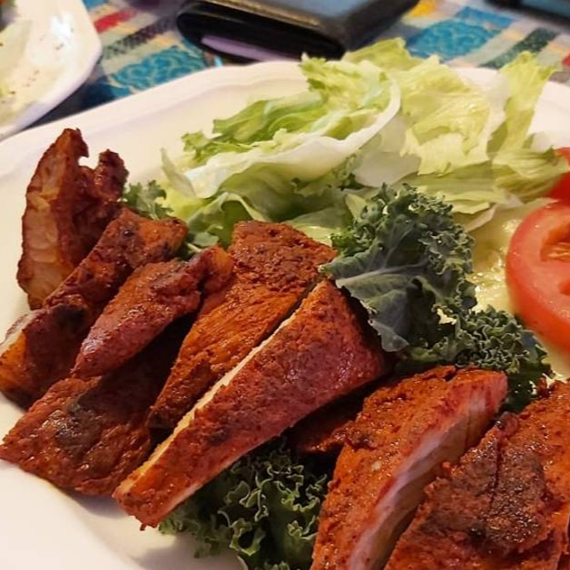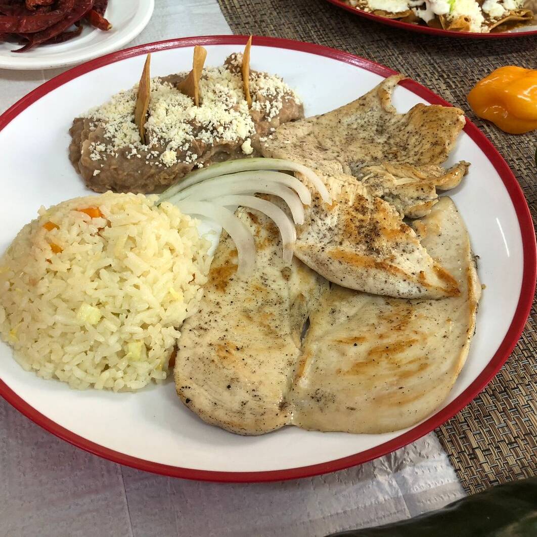 Jugosa selección de pechuga de pollo acompañada ENSALADA y frijoles refritos!