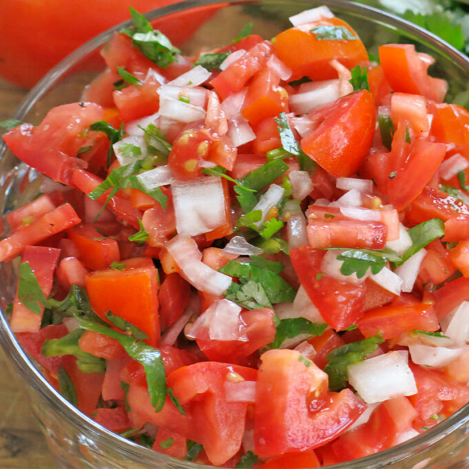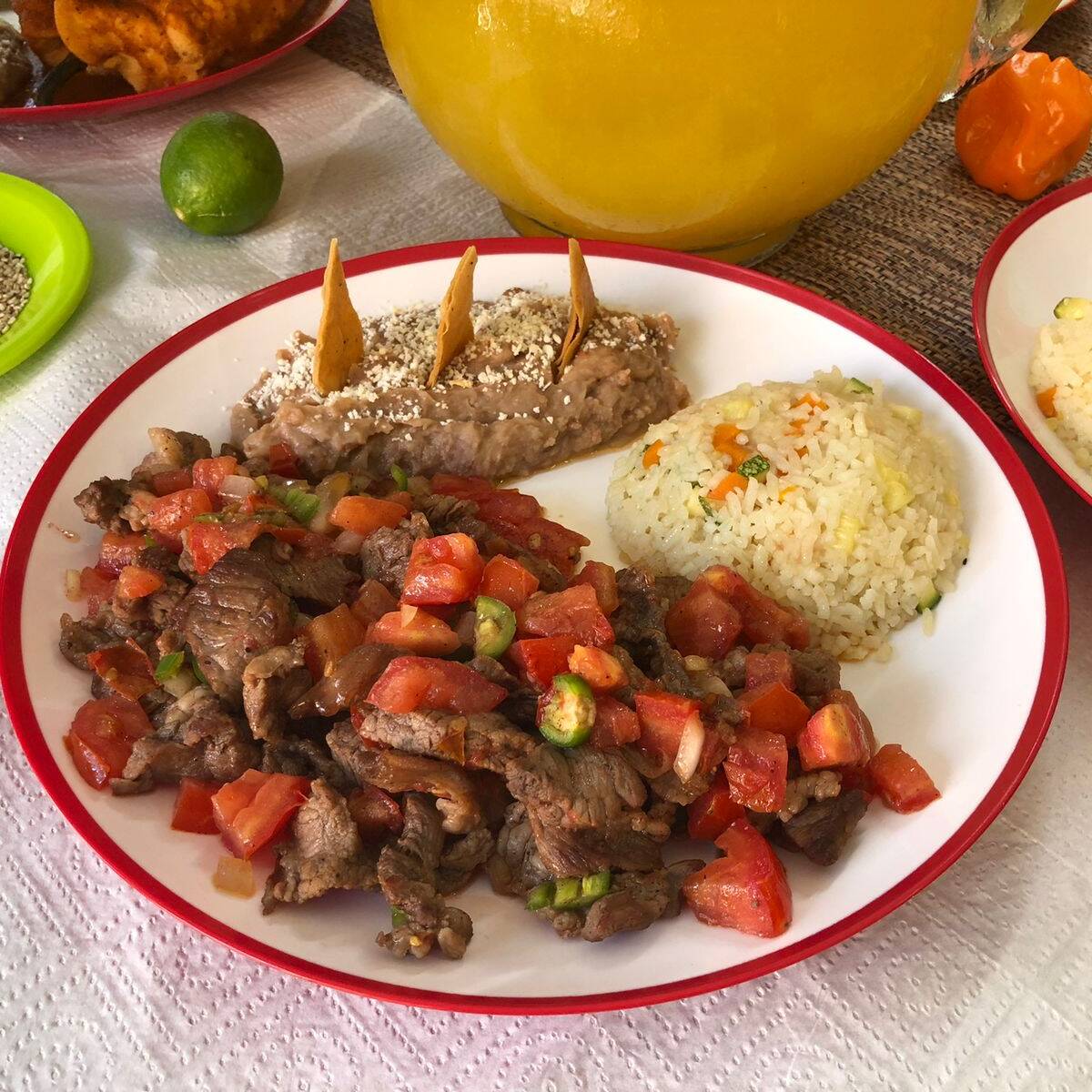 Suave sirloin a la cacerola con jitomate, cebolla y chile serrano acompañado con ensalada y frijoles refritos.